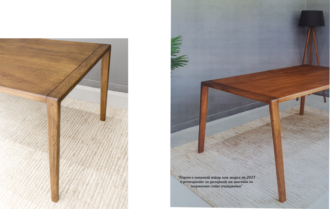 Каран масата може да се изработи од бука, даб и орев во боја ли нијанса по желба и во дмензија по потреба на клиентот. Цена за трпезариска маса КАРАН