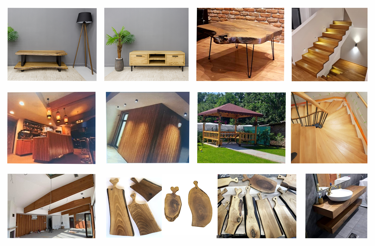 Скалници, парапетни даски, даски за сервирање, шанкови, декоративни ѕидови, ТВ платформи, единечни и лежаи за спална, наткасни, комоди, елементи за купатило со импрегнација, декорации и др.